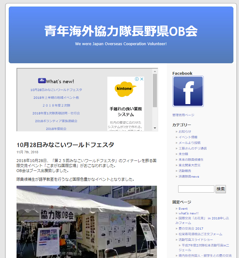 青年海外協力隊長野県OB会さんホームページ ITサービス Twitter Facebook LINE 2018.11.07 青年海外協力隊長野県OB会さんのホームページです。 wordpress使っております。 404 Not Found